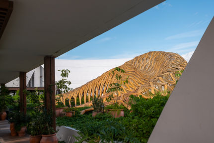 Designed by Arquitectura Mixta, the Kanai Pavilion explores the expressive potential of bamboo as both structure and spatial experience. The flowing lattice canopy creates a dynamic interplay of light, shadow and movement, framing the surrounding landscape while sheltering a reflective cenote below.